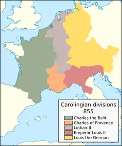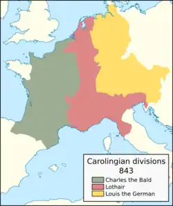 Juste avant de mourir, Charlemagne couronna empereur son unique fils Louis Ier (r. –) mais son règne fut marqué par les luttes de pouvoir entre ses fils. Avant sa mort, il divisa l'Empire entre son fils aîné Lothaire (d. 855) qui obtint la Francie orientale située à l'est du Rhin et son plus jeune fils, Charles (d. 877) qui reçut la Francie occidentale, tandis qu'un troisième fils, Louis (d. 876), fut autorisé à régner sur la Bavière sous la suzeraineté de Charles. Le partage fut contesté après la mort de Louis Ier et au terme d'une guerre civile de trois ans, les frères s'accordèrent sur le traité de Verdun[86]. Charles obtint les territoires occidentaux correspondant à une grande partie de la France actuelle, Louis reçut la Bavière et les territoires orientaux de l'Empire aujourd'hui situés en Allemagne tandis que Lothaire conserva son titre d'empereur et régna sur la Francie médiane située entre les possessions de ses deux frères[86]. Ces royaumes furent à leur tour divisés et toute cohésion interne disparut[87]. La dynastie carolingienne s'éteignit en Francie orientale en 911 avec la mort de Louis IV[88] et le choix de Conrad Ier sans lien de parenté[89]. Elle perdura plus longtemps en Francie occidentale mais fut finalement remplacée en 987 par la dynastie capétienne avec le couronnement de Hugues Capet (r. –).