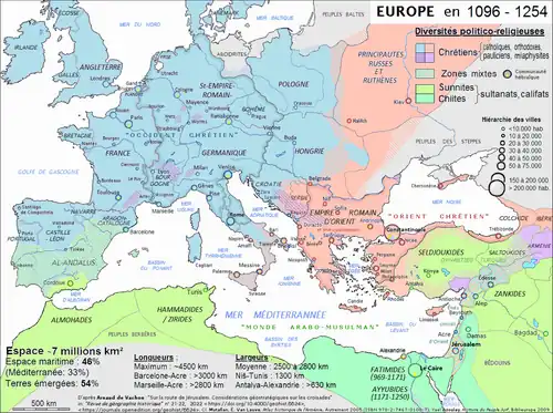 La volonté de reprendre les Lieux Saints aux musulmans et la politique de l'empereur byzantin Alexis Ier (r. –) visant à leur reprendre l'Anatolie centrale, motivèrent le lancement de la Première croisade par le pape Urbain II (pape 1088-1099) lors du concile de Clermont en 1095. Le pape promit d'accorder des indulgences à tous ceux qui participeraient, et des dizaines de milliers de personnes venant de toutes les couches sociales et de toute l'Europe se mirent en route vers la Terre sainte[166]. Jérusalem fut prise en 1099 et les croisés consolidèrent leurs conquêtes mais les musulmans ne s'y résignèrent pas, et le voisinage dégénéra régulièrement en conflits. De nouvelles croisades furent donc lancées par la Papauté pour soutenir les États latins d'Orient[166], comme la Troisième destinée à reprendre Jérusalem capturée par Saladin (d. 1193) en 1187[167].