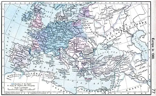 Au début de la période, les actuelles France orientale, Belgique, Pays-Bas, Allemagne occidentale, Suisse et Italie du nord étaient gouvernées par la dynastie ottonienne qui s'opposait à de puissants ducs comme ceux de Saxe ou de Bavière, dont les territoires remontaient à l'Antiquité tardive. En 1024, les Ottoniens laissèrent place à la dynastie franconienne et l'un de ses membres, l'empereur Henri IV (r. –), affronta la Papauté au sujet de la nomination des évêques lors de la querelle des Investitures[143]. Ses successeurs continuèrent à se battre contre la puissance politique de Rome et contre la noblesse allemande : il s'ensuivit une période d'instabilité notamment après la mort sans héritiers d'Henri V (r. –), jusqu'à ce que Frédéric Barberousse devienne empereur (r. –)[144]. Même s'il gouverna efficacement, les problèmes fondamentaux perdurèrent et continuèrent d'affecter ses successeurs[145] comme son petit-fils Frédéric II (r. –), qui fut excommunié à deux reprises[146]. En Europe orientale, le milieu du XIIIe siècle fut marqué par une grande invasion mongole, victorieuse lors des batailles de Legnica et de Mohi en 1241, et qui se traduisit par de grands pillages et destructions, jusqu'à ce que les Mongols et Tatars s'installent et exploitent leurs conquêtes en réclamant tribut aux souverains européens. Toutefois leurs crises de succession les affaiblirent : progressivement, les principautés russes, la Lituanie, la Pologne et la Moldavie s'émancipèrent de la tutelle des Mongols et des Tatars[147] et les repoussèrent dans ce qui est aujourd'hui l'Ukraine méridionale, où ces peuples des steppes, initialement tengristes se convertirent à l'islam et s'allièrent à l'Empire ottoman[148].