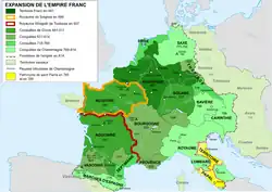 Les successeurs de Charles Martel, formant la dynastie carolingienne prirent le contrôle des royaumes d'Austrasie et de Neustrie lors d'un coup d'État organisé en 753 par Pépin III (r. –). Cette accession au pouvoir fut accompagnée d'une propagande représentant les Mérovingiens comme des souverains incapables et cruels et qui vantait les exploits de Charles Martel et la grande piété de sa famille. Comme cela était la tradition à l'époque, le royaume de Pépin III fut partagé à sa mort entre ses deux fils Charles (r. –) et Carloman (r. –). Quand ce dernier mourut de causes naturelles, son frère profita de la situation pour réunifier les possessions de son père. Charles, généralement appelé Charles le Grand ou Charlemagne, entreprit une politique d'expansion agressive qui permit d'unifier une grande partie de l'Europe occidentale au sein de l'Empire carolingien s'étendant sur la majeure partie de l'actuelle France, du nord de l'Italie et de l'ouest de l'Allemagne moderne.
