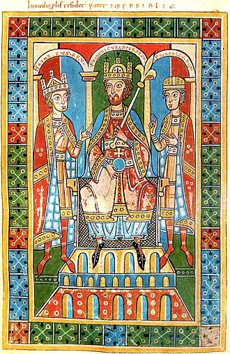 Le Moyen Âge central vit la formation des principaux États d'Europe occidentale et centrale. Les rois de France, d'Angleterre et d'Espagne renforcent leur pouvoir face à leurs nobles et instaurent des institutions durables[140]. Convertis au christianisme, les Slaves, les Bulgares et les Magyars fondent aussi des royaumes tels que la Rous', la Tchéquie, la Pologne, la Bulgarie et la Hongrie[141]. Après avoir été longtemps attachée à son indépendance par rapport aux souverains Lombards, Romains d'Orient, Francs ou Germaniques, la Papauté revendiqua une autorité temporelle sur l'ensemble du monde chrétien, mais après la séparation des Églises d'Orient et d'Occident seules ces dernières s'y soumirent ; cette « monarchie papale » atteignit son apogée au XIIIe siècle sous le pontificat d'Innocent III (pape de 1198 à 1216)[142].