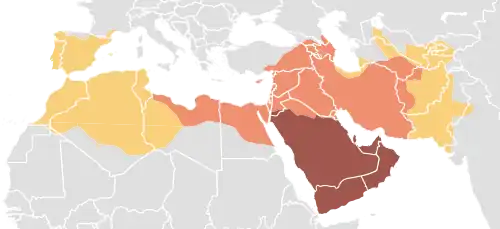 L'Empire byzantin et la Perse connurent un grand foisonnement religieux au VIe siècle. En plus du christianisme et de ses nombreux courants idéologiques, le judaïsme et le zoroastrisme étaient également influents, tandis que des cultes polythéistes existaient dans la péninsule arabique. Dans les années 610 et 620, Mahomet fonda une nouvelle religion, l'islam, et unifia les tribus arabes[62]. Profitant du chaos provoqué par la guerre entre l'Empire byzantin et la Perse, les Arabes annexèrent les seconds entre 637 et 642 et chassèrent les premiers du Levant en 634-635 et de l'Égypte en 640-641. Ils envahirent également l'Afrique du Nord à la fin du VIIe siècle et la péninsule ibérique qu'ils appelèrent Al-Andalus dans les années 710[63],[64].