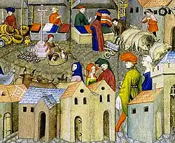 La Révolution commerciale (en) fut initiée dans le nord de l'Italie avec l'apparition des premières banques facilitant les échanges commerciaux[221]. Les bénéficiaires de ces développements, comme les Fugger en Allemagne, les Médicis en Italie ou des individus comme Jacques Cœur en France, accumulèrent d'immenses fortunes et une large influence politique[222]. Le système financier de l'Incanto des galées du marché permit la création de l'Arsenal de Venise employant des milliers d'employés et produisant des galères sur un rythme presque industriel. Les guildes se développèrent dans les villes et des organisations reçurent des monopoles sur le commerce de certains produits comme le Staple avec la laine en Angleterre[223]. À l'inverse, les foires déclinèrent avec le développement de routes maritimes entre la Méditerranée et l'Europe du Nord et des villes comme Bruges devinrent des places financières de premier plan avec la création des premières bourses. Après la dépopulation causée par la Peste noire, les villes connurent une forte croissante démographique. Vers 1500, Venise, Milan, Naples, Paris et Constantinople comptaient chacune plus de 100 000 habitants, tandis qu'une vingtaine d'autres dépassaient les 40 000 personnes[224].