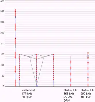 - Antenne fouet à bobine (10 watts input sur 500 kHz arrivant à une antenne verticale de 10 mètres, le tout correctement adapté donne 100 mW ERP)