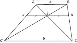 Dans un trapèze convexe de bases de longueurs , le segment parallèle aux bases joignant les deux côtés et passant par le point d'intersection des diagonales a pour longueur la moyenne harmonique de , ceci quelles que soient les longueurs des côtés.