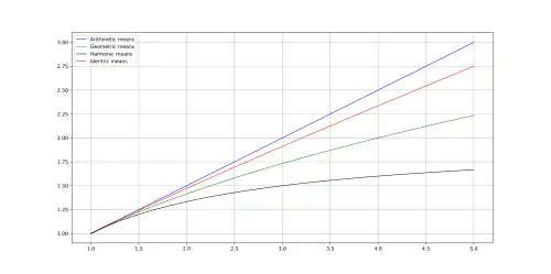 La moyenne identrique de deux nombres réels positifs x , y est définie comme [1]: