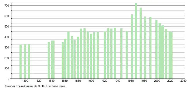 L'évolution du nombre d'habitants est connue à travers les recensements de la population effectués dans la commune depuis 1793. Pour les communes de moins de 10 000 habitants, une enquête de recensement portant sur toute la population est réalisée tous les cinq ans, les populations de référence des années intermédiaires étant quant à elles estimées par interpolation ou extrapolation[17]. Pour la commune, le premier recensement exhaustif entrant dans le cadre du nouveau dispositif a été réalisé en 2004[18].