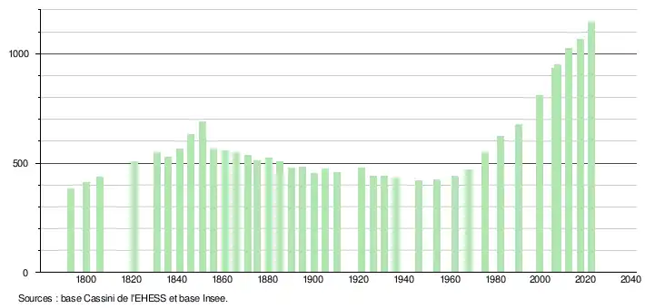 L'évolution du nombre d'habitants est connue à travers les recensements de la population effectués dans la commune depuis 1793. Pour les communes de moins de 10 000 habitants, une enquête de recensement portant sur toute la population est réalisée tous les cinq ans, les populations de référence des années intermédiaires étant quant à elles estimées par interpolation ou extrapolation[21]. Pour la commune, le premier recensement exhaustif entrant dans le cadre du nouveau dispositif a été réalisé en 2007[22].