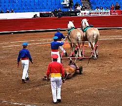 Pour emmener le taureau, les mulilleros enroulent une corde autour de ses cornes et l'attachent à la barre de traction pour le tirer hors de la piste. La coutume veut qu'ils arrivent tête nue, mais qu'ils se couvrent pour effectuer leur tâche.