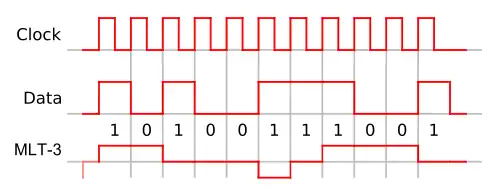Un signal MLT-3 cycle successivement aux niveaux de tension « -1 », « 0 », « +1 », etc. Il passe au niveau suivant de la séquence pour transmettre un bit à 1, et reste au même niveau pour transmettre un bit à 0.