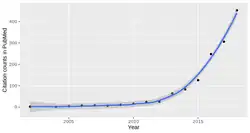 Une évolution nette du nombre de publications incluant la multiomique — dans leur méthodologie ou leur sujet — apparaît à la fin des années 2000 (cf. graphique Pubmed ci-contre) ; ce nombre passant de zéro en 2000 à plus de 400 par an en 2018 ; ce chiffre croissait alors de manière exponentielle.