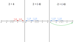 Ces exemples expliquent la règle concernant les nombres ayant un signe. Pour effectuer le produit de deux nombres signés, on effectue le produit de leurs valeurs absolues et on affecte au résultat le signe – si les signes des deux facteurs sont différents, et le signe plus (+) si les deux facteurs ont même signe.