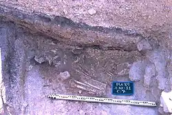 La présence de sépultures humaines sur le site est attestée par la fouille d'une petite grotte funéraire à proximité du village, sur l'escarpement du côté sud-est, qui a fourni les restes d'au moins quatre individus, des ossements d'animaux et une partie du trousseau qui accompagnait les enterrés. En revanche, sur son versant sud le plus occidental, dans l'espace délimité par un large mur et par différents rangs de pierre qui se succèdent le long du versant extérieur, a été creusée une fosse circulaire qui contenait une autre sépulture humaine, sous une sédimentation de plus plus de deux mètres. Le défunt était en position fœtale, en décubitus latéral droit, les jambes fléchies et les pieds croisés. Le bras droit étendu derrière le dos et la main écrasée par un bloc. Le bras gauche était plié devant le corps et la main était tendue sous le visage, manquant la majeure partie du crâne et de la mâchoire supérieure. La datation absolue au Carbone-14 de cet individu a fourni une date de 3760 ans, entre 2210 et 2130 av. J.-C..