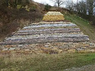Le lourd ensemble des strates rocheuses est retenu par une bêche: il s'agit d'une butée située à sa base et destinée à résister à l'effort horizontal de glissement du talus. L'ouvrage est composé d'une succession de bancs de blocs de roches disposés à la manière d'un mur de pierre sèche sur une épaisseur d'environ cinquante centimètres. À l'exception d'une couche de roche magmatique (le porphyre de Quenast), il est composé de roches sédimentaires qui se sont déposées au cours des pérégrinations de l'Ardenne au fil des temps géologiques. La région se déplaça du cercle polaire antarctique à sa latitude actuelle et fût tantôt submergée, tantôt émergée, parfois même au sommet d'une montagne. La succession des roches racontent cette histoire.