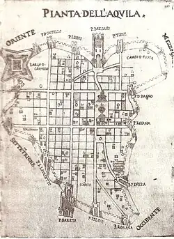 Au XVIe siècle, la domination espagnole modifie l'équilibre du territoire en séparant définitivement la ville de la campagne, cette dernière étant divisée en fiefs et remise en possession par les capitaines de l'armée impériale, et contribuant à la perte d'importance de la ville. Les Espagnols réaliseront également une autre opération qui sera importante pour l'avenir de la ville : entre 1534 et 1567, ils obligeront les citoyens à détruire tout un quartier, et le tronçon de muraille correspondant, en correspondance avec les locaux de Paganica et Tempera pour la construction du Fort espagnol qui entraînera également la fermeture de la Porta Barisciano (plus tard remplacée par la Porta Castello) et sa démolition ultérieure.