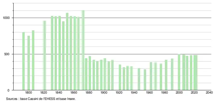 L'évolution du nombre d'habitants est connue à travers les recensements de la population effectués dans la commune depuis 1793. Pour les communes de moins de 10 000 habitants, une enquête de recensement portant sur toute la population est réalisée tous les cinq ans, les populations de référence des années intermédiaires étant quant à elles estimées par interpolation ou extrapolation[26]. Pour la commune, le premier recensement exhaustif entrant dans le cadre du nouveau dispositif a été réalisé en 2005[27].
