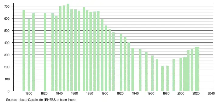 L'évolution du nombre d'habitants est connue à travers les recensements de la population effectués dans la commune depuis 1793. Pour les communes de moins de 10 000 habitants, une enquête de recensement portant sur toute la population est réalisée tous les cinq ans, les populations de référence des années intermédiaires étant quant à elles estimées par interpolation ou extrapolation[49]. Pour la commune, le premier recensement exhaustif entrant dans le cadre du nouveau dispositif a été réalisé en 2004[50].