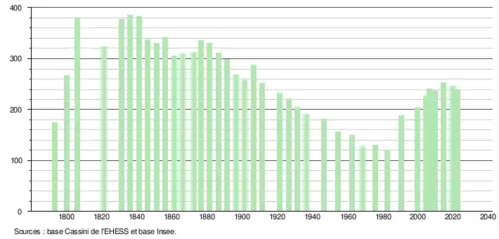 L'évolution du nombre d'habitants est connue à travers les recensements de la population effectués dans la commune depuis 1793. Pour les communes de moins de 10 000 habitants, une enquête de recensement portant sur toute la population est réalisée tous les cinq ans, les populations de référence des années intermédiaires étant quant à elles estimées par interpolation ou extrapolation[19]. Pour la commune, le premier recensement exhaustif entrant dans le cadre du nouveau dispositif a été réalisé en 2004[20].
