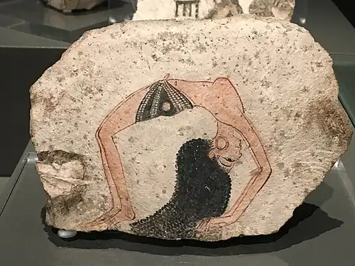 Tesson de poterie figurant une ballerine en position acrobatique. Calcaire. Collection Drovetti |