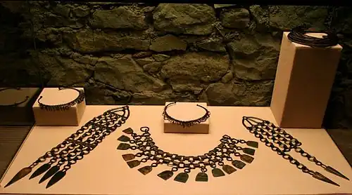 Ces objets comprennent 21 torques, 4 boutons, 2 anneaux et surtout une exceptionnelle ceinture de 238 pièces de bronze s'organisant en deux parties :