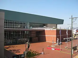 Devant la façade du musée sont exposés un Canon de 41 cm/45 Type 3ème Année, un gouvernail, une ancre et une hélice du cuirassé Mutsu.