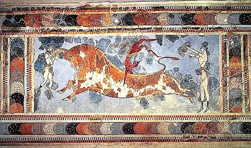 - L'athlète représenté en train de sauter au-dessus d'un taureau.