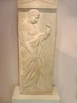 Stèle d'un jeune athlète tenant un strigile. Traces de peinture bleue pour le fond, jaune pour les cheveux, bande rouge sous les pieds du personnage. |