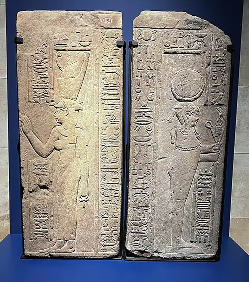 Deux fragments de linteau du temple de l’Est à Karnak, ou temple de Ramsès II dans l'enceinte d'Amon-Rê[7]. Grès, bas-relief saillant, H. 86 cm. env.