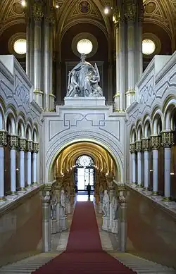 Les Grands escaliers sont, eux aussi, somptueusement décorés. À l'entresol, on peut voir les effigies en pied de quatre généraux qui, au contraire des statues de la Feldherrenhalle, sont engagées dans des niches très surélevées. Ce sont des protagonistes du Printemps des Peuples, à savoir les commandants qui, pour le compte de la Maison de Habsbourg, ont réprimé dans le sang les soulèvements révolutionnaires aux quatre coins de l’empire : Julius von Haynau, Joseph Radetzky, Alfred de Windisch-Graetz et Josip Jelačić. L'ordonnance des statues des Grands Escaliers a été confiée à Carl Rahl, qui en 1864 s'est pour cela aidé de deux de ses élèves, Christian Griepenkerl et Eduard Bitterlich. Au milieu du plafond doré, des fresques allégoriques représentent la Puissance et l’Unité (au centre), Renommée et Honneur (à droite) et l’Intelligence et le Courage (à gauche). Ces Grands Escaliers sont couronnés d'un groupe sculpté allégorique en marbre, Austria de Johannes Benk, réalisé en 1869.