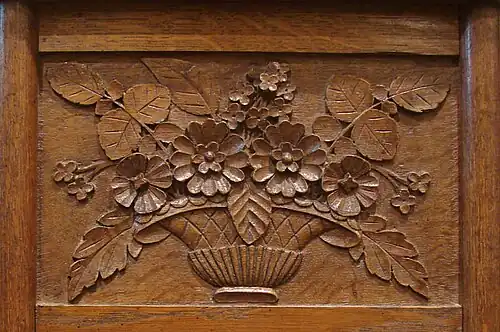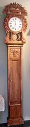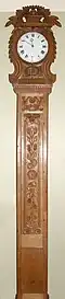 L’horloge Saint-Nicolas est une horloge de parquet qui tient son nom de la commune de Saint-Nicolas-d'Aliermont en Normandie. Amenée dans le bourg par l’horloger Charles-Antoine Croutte en 1725, cette horloge « à tête fleurie » se caractérise par un mécanisme plat, entièrement en laiton, muni d’un balancier court et d’un corps étroit surmonté d’une tête sculptée avec son cadran doté de belles aiguilles[2]. Plus petit que celui d’une horloge comtoise, son mécanisme a une facture typiquement horlogère tandis que le mouvement comtois, à cage en fer, est d’une conception issue plutôt de la serrurerie. Des nouveautés techniques sont apportées aux horloges, notamment grâce à Christian Huygens et à sa conception de l’horloge à pendule en 1657, qui a fait basculer la société dans le monde moderne. Les ébénistes, eux aussi, ont apporté leur art à l’horloge Saint-Nicolas. On ne connaît le nom que de l’un d’entre eux, Spiridion Cartier, qui a laissé sa signature sur de nombreuses Saint-Nicolas[3]. Le plus souvent, les caractéristiques esthétiques de l’horloge représentent une corbeille à fleurs au sommet de celle-ci, les fleurs et les végétaux sont également très présents sur le cadran et le corps généralement en chêne, orme ou sapin. D’autres motifs font leur apparition, classiques de l’art populaire normand tels que les colombes bec à bec, symboles d'amour et de mariage, le blé et la vigne, symboles de prospérité, ainsi que des motifs plus politiques tels que le bonnet phrygien et l’aigle impérial de Napoléon.