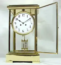 Petite horloge transportable, la pendulette de voyage est créée des mains d’Abraham-Louis Breguet (1747-1823), horloger de formation, qui conçoit la première pendulette de voyage au début du XIXe siècle, à Paris[4]. Munie d’une poignée amovible sur le dessus, la pendulette de voyage possède un mécanisme fermement fixé dans une cage en laiton rectangulaire. Le plus souvent, le mécanisme est apparent grâce aux platines transparentes de la pendulette. À Saint-Nicolas d’Aliermont, l’entreprise Couaillet Frères, fondée en 1903, produit de la fin du XIXe siècle jusqu’aux années 1920 des milliers de pendulettes de voyages. De nombreuses variétés sont alors fabriquées. Une pièce dans les collections du musée est particulièrement exceptionnelle, réalisée manuellement par le nicolaisien Armand Couaillet[5]. Composée de près de 500 pièces, cette pendulette de voyage est munie d’un cadran en ivoire et de plusieurs complications : une sonnerie au passage, une sonnerie aux quarts, une fonction d’heure à la demande ainsi qu’un réveil. Alliant élégance et sobriété, la pendulette de voyage a généralement un cadran blanc assez lisible ainsi qu’un décor à la fois chic et traditionnel.