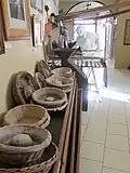 - Rez-de-chaussée : des pains exposés avec une collection de documents sur le métier en lui-même. On y trouve tous les outils nécessaires à l'enfournement des pains: fourche à fagots, tire-braise, étouffoir, pelles, panière en jonc, etc. On y trouve aussi la partie réservée à la préparation de la pâte : pétrins, bannetons, tamis, raques, planchons et bacs à farine.