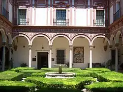 La façade du bâtiment est un exemple de cette fusion. De composition rigide, l’ordonnancement est allégé par les éléments décoratifs typiques du baroque sévillan, dont certains furent ajoutés postérieurement à l’édification de la façade. Les fenêtres, encadrées par des pilastres, sont surmontées de festons. Le portail, qui fut plaqué dans les années 1940 après avoir été détaché d’une autre partie de l’édifice, est nettement marqué par le goût baroque : colonnes torses, fronton brisé, statuaire...