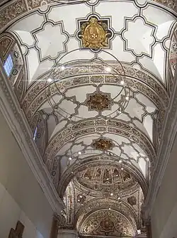 L’intérieur s’ordonne sur deux niveaux, autour de deux cloîtres ceints de galeries à arcades, et de deux patios. Ces quatre espaces sont agrémentés de plantations diverses et de pièces d’eau. Les deux étages sont reliés par un monumental escalier de style maniériste. La pièce la plus spectaculaire est sans conteste l’église conventuelle, surmontée d’une haute voûte en berceau ornée de peintures.