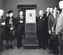 - ↑ Le capitaine de l'armée des États-Unis Deane Keller près de la tête de la statue de bronze de Cosme Ier de Toscane, par Giambologna, en dehors de Poggio a Caiano. Cette statue, située sur la Place de la Signoria, à Florence, a été cachée aux pillards nazis en 1943 et récupérée en par Keller et d'autres.