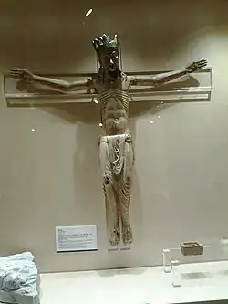 - Le Christ de Casarilh (venant de l'église de Saint Tomás de Casarilh) : c'est une sculpture en bois polychrome de la fin du XIIe siècle/débuts du XIIIe siècle, de manufacture spécifiquement aranaise. Constitué de trois pièces en bois emboîtées qui forment la tête, le corps et les jambes, d'un christ à la couronne d'épines et de fleurs de lys, ou en majesté de 103 x 103 x 15 cm, au visage large, nez fin, yeux grands, bouche petite et barbe généreuse, habillé avec un drap depuis la taille jusqu'aux genoux. Le torse nu est détaillé avec un travail anatomique minutieux, surtout au niveau des épaules La polychromie actuelle n'est pas originale mais date du XIVe siècle[13] Le Christ est fixé sur une croix du XIXe siècle, époque à laquelle correspondait sûrement la polychromie antérieure à la restauration faite par le Service de Restauration de Biens Mobiliers de Catalogne en 2012. La pièce a été présentée à l'exposition internationale d'art roman de Barcelone de 1961. Elle est actuellement exposée dans une vitrine du deuxième étage du Musèu du Val d'Aran[14].