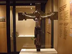 - Le Christ d'Escunhau (venant de l'église de Saint Pierre d'Escunhau) : c'est une sculpture romane du XIIIe siècle réalisée en bois polychrome, donnant une image du Christ de 92 x 75 cm avec une croix de 141 x 108 x 3'5 cm, qu'on attribue comme en provenance de l'atelier d'Urgell. Elle représente un christ couronné, ou en majesté, au visage large, nez fin, yeux grands, bouche petite et barbe généreuse, avec le buste peu travaillé, habillé de la taille jusqu'aux genoux avec un drap. La croix présente dans sa polychromie, la représentation de l'Agnus Dei et à l'intersections de la croix le tétramorphe. On peut lire aussi l'inscription à moitié effacée “S MARCHUS” (au bras droit), “S LUCHA” (au bras gauche) “ANES” (dans le bras supérieur de la croix) et “S” et “M” dans la partie inférieure. Les inscriptions sont incomplètes. Avec la perte de la couche picturale, s'est aussi perdue la représentation de l'aigle de Saint Jean qui était située dans la partie supérieure, et la moitié de la figure de l'ange, symbole de Saint Matthieu Evangeliste, située dans la partie inférieure. L'avers de la croix est décoré avec des motifs floraux en relief avec des applications de pâte qui sont peut-être issus d'une restauration[13] Initialement on l'exposait dans l'autel de l'église devant les portes d'un retable baroque, avant d'être conservé dans une maison particulière du village d' Escunhau[15]. Elle est actuellement exposée dans une vitrine du deuxième étage.