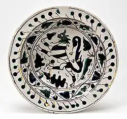 Bassine peinte de motifs géométriques et d'animaux stylisés, Faenza, XIVe siècle.