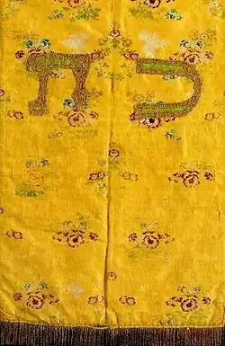 Ce manteau de Torah a été trouvé en 1967 dans la réserve de la synagogue d'Endingen (Argovie) en Suisse. Il s'agit d'une soie française du XVIIIe siècle, utilisée à l'origine comme robe de femme, peut-être même comme robe de mariée. Le matériel a été converti en manteau de Torah, une pratique controversée, mais assez courante avant le XXe siècle[9]. |