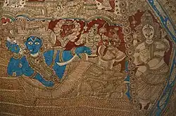 Le fragment visible au musée donne à voir une composition commanditée pour cette fondation shivaïte : la belle apsara Tilottama, sous un arbre dont elle était en train de cueillir les fleurs odoriférantes, lorsqu'elle est surprise par les démons Sunda et Upasunda. Les dieux ont délégué la belle afin de donner l'occasion à ces deux démons de se détruire mutuellement et ainsi mettre fin à leur démoniaque pouvoir, bien qu'obtenu par l'ascèse, telle qu'elle est conçue dans de monde de l'hindouisme[N 2].