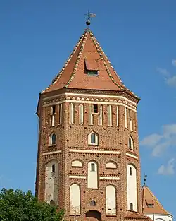 Le château est mentionné pour la première fois en 1395, mais l'édifice actuel, de style gothique tardif, ne commence qu'en 1522. La propriété est ensuite héritée par la famille Radziwill, grande maison noble polonaise de Biélorussie[15]. Au cours des siècles suivants, le château subit de graves dommages à plusieurs reprises, particulièrement lors des guerres napoléoniennes[16]. La restauration entreprise par les Polonais dans les années 1930 fut interrompue par la Seconde Guerre mondiale et l'édifice accueillit alors un ghetto et une caserne[15]. L'État biélorusse fit l'acquisition du domaine en 1947 et, en 1981, une grande campagne de restauration est lancée[15]. Le château devient à partir de cette date une école d'art. En 1991, une nouvelle campagne de restauration est entreprise, elle est approuvée par l'Unesco en 1992 et elle permet l'établissement d'un musée dans une des tours. Le château est inscrit sur la liste du patrimoine mondial de l'Unesco en 2000[15].