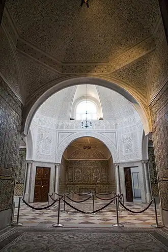 Construit par des architectes tunisiens, le Grand Palais, lieu de résidence du bey de Tunis, est construit dans la deuxième moitié du XIXe siècle sous l'impulsion de Mohammed Bey puis de Sadok Bey[9]. Mohamed Yacoub dit de lui qu'il « constitue un monument fort représentatif du luxe et du raffinement qu'a connus l'architecture tunisienne durant l'époque beylicale. Il témoigne également du caractère éclectique de l'art de cette époque, dans lequel les apports locaux se mêlent aux influences andalouses, asiatiques et européennes »[9],[B 1].