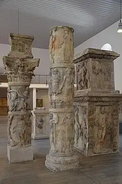 La grande colonne de Jupiter à Mayence, mesurant plus de 9 m de haut, montre bien comment les édifices antiques peuvent faire le récit du passé de manière vivante. L’inscription au pied de la colonne dévoile un chapitre agité de l’histoire romaine, du temps de l’empereur Néron. On déchiffre vaguement les mots « Nero » et « pro salute », qui ensemble signifient "en l’honneur de Néron". Une copie de cette colonne se trouve à Musée d'archéologie nationale à Saint-Germain-en-Laye.
