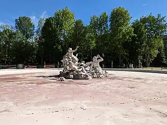 Au centre de la partie clôturée des Jardins est aménagé un bassin en marbre blanc, avec la fontaine des Néréides et des Tritons[4]. Le bassin est entouré de douze statues d’êtres mi-humains, mi-aquatiques, œuvres du sculpteur de cour Simone Martinez, en 1755.