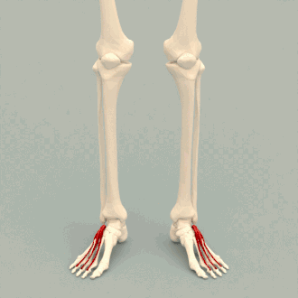 Les tendons fusionnent avec le bord latéral de chaque tendon correspondant du muscle long extenseur des orteils au niveau des deuxième, troisième et quatrième articulations métatarso-phalangiennes.