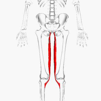 Sous forme de muscle aplati, il descend en longeant le bord interne de la cuisse, passe derrière le condyle médial du fémur pour se diriger en dehors vers la patte d'oie.