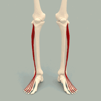 Le muscle long extenseur des orteils est éverseur (fléchisseur dorsal, abducteur et pronateur) par correspondance au niveau de la cheville et il est extenseur des quatre derniers orteils.