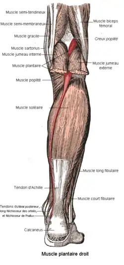 Le muscle plantaire descend sur la capsule du genou, se dirigeant en bas et en dedans pour glisser entre le muscle gastrocnémien et le muscle poplité puis se transformant en un long tendon, entre les muscles gastrocnémien et soléaire pour venir longer médialement le tendon calcanéen.