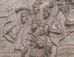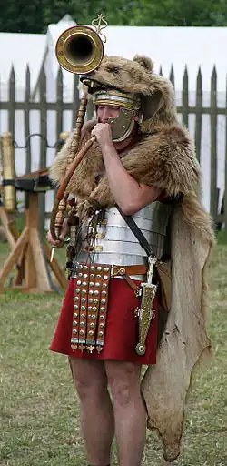 - Le corps du buccin ou cornu, un instrument de la famille des cuivres, affectait une forme semi-circulaire, ou plus précisément la forme de la lettre G ; il possédait parfois un raidisseur (ou poignée) transversal. La perce était conique (comme celle du cor d'harmonie) et l'embouchure était tronconique. C'était également un instrument militaire, et comme la tuba, il était hérité des Étrusques. Le joueur de cornu était appelé cornicen[7]. De même, le joueur de tuba était appelé tubicen.
