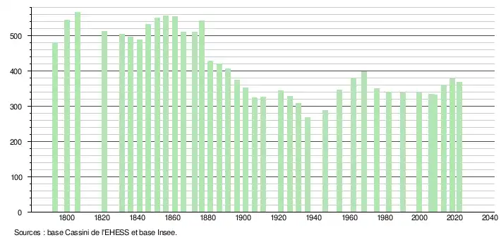 L'évolution du nombre d'habitants est connue à travers les recensements de la population effectués dans la commune depuis 1793. Pour les communes de moins de 10 000 habitants, une enquête de recensement portant sur toute la population est réalisée tous les cinq ans, les populations de référence des années intermédiaires étant quant à elles estimées par interpolation ou extrapolation[18]. Pour la commune, le premier recensement exhaustif entrant dans le cadre du nouveau dispositif a été réalisé en 2008[19].